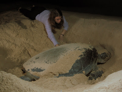 This turtle had just finished digging her nest and laying close to a hundred eggs (covering herself with sand in the process) when she took a moment to rest and hang out with my lovely wife.